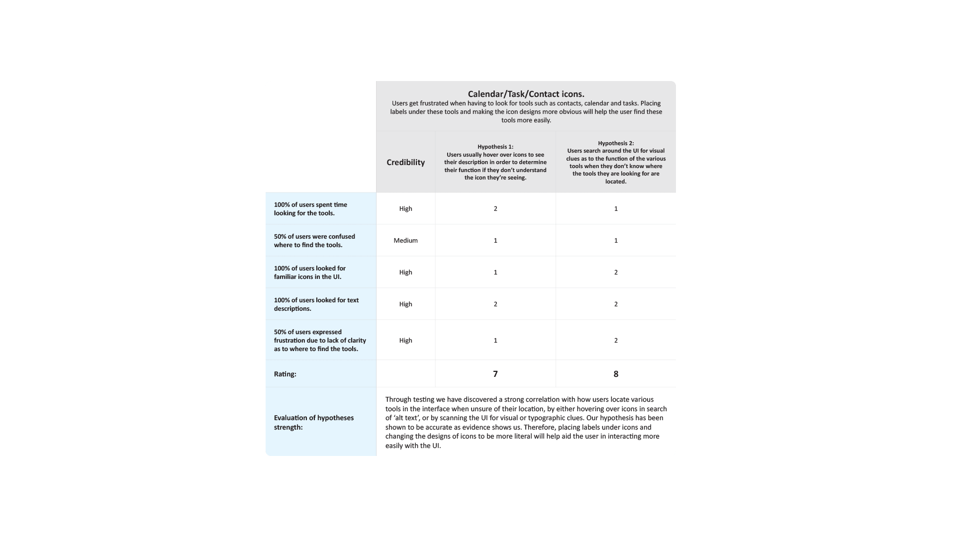 Findings: Users spent more time than they liked searching for the tools they needed the most (Calendar, Tasks, Contacts) and resorted to hovering over all the icons on the interface to find them. The design language of iconography used for tools such as the calendar, tasks, and contacts are confusing to understand and don’t accurately represent their purpose.