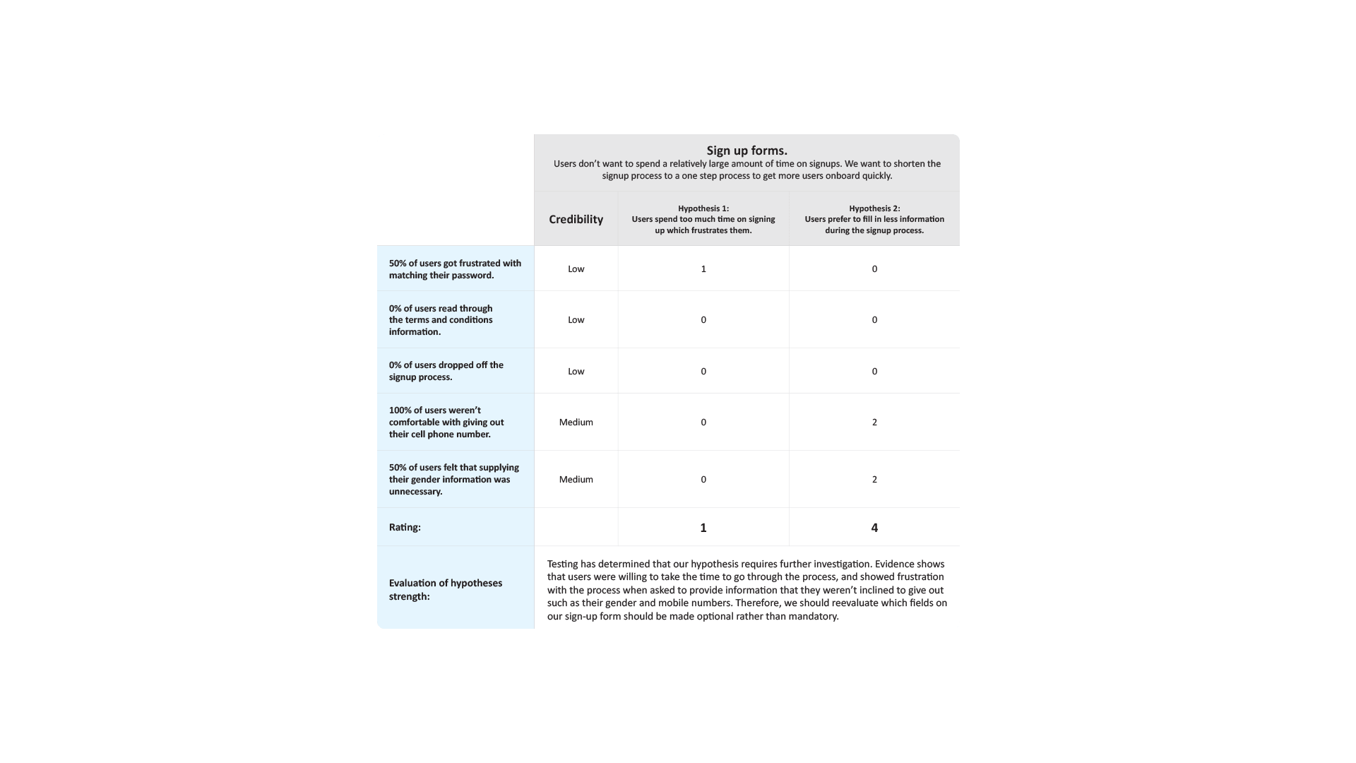 Hypothesis evaluation matrix