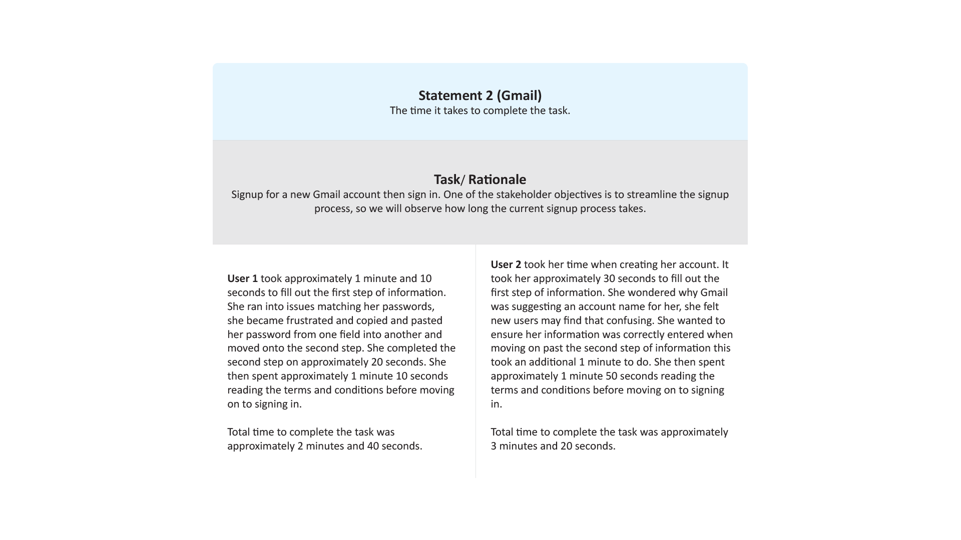 The research methods I used for gathering evidence touched on qualitative, quantitative, and behavioral methodologies. Unfortunately, due to budget constraints, only two of the five requested users were tested.